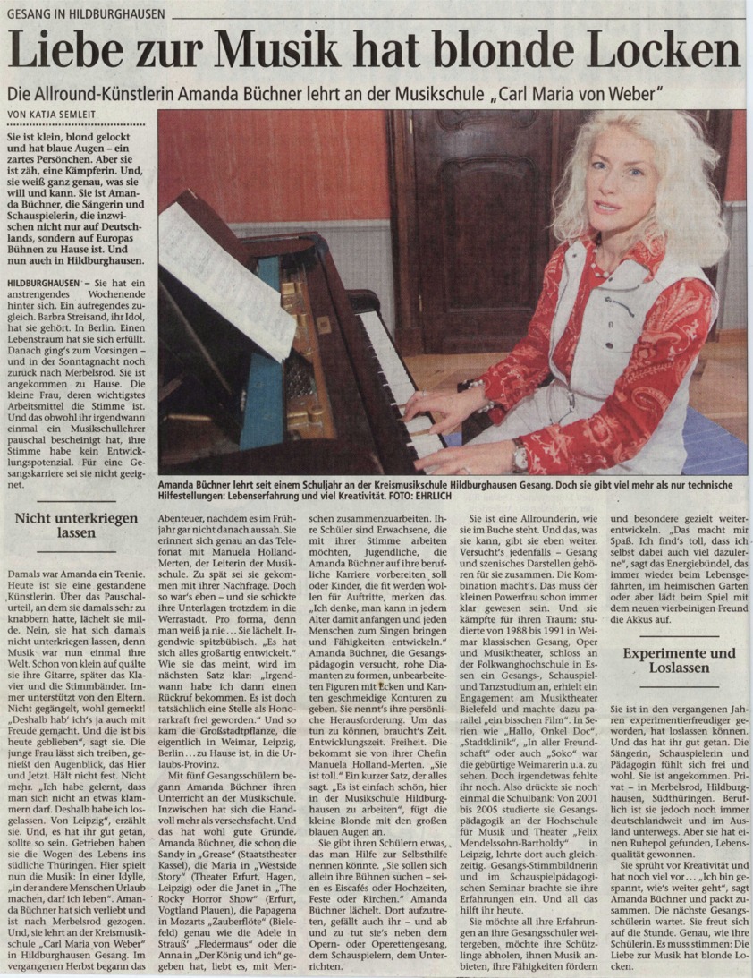An der Landesmusikakademie Sondershausen wirke ich seit 2009 als Mentorin für Stimmbildung und an der Musikschule Max Reger Meiningen, AS Zella Mehlis, als Gesangspädagogin.